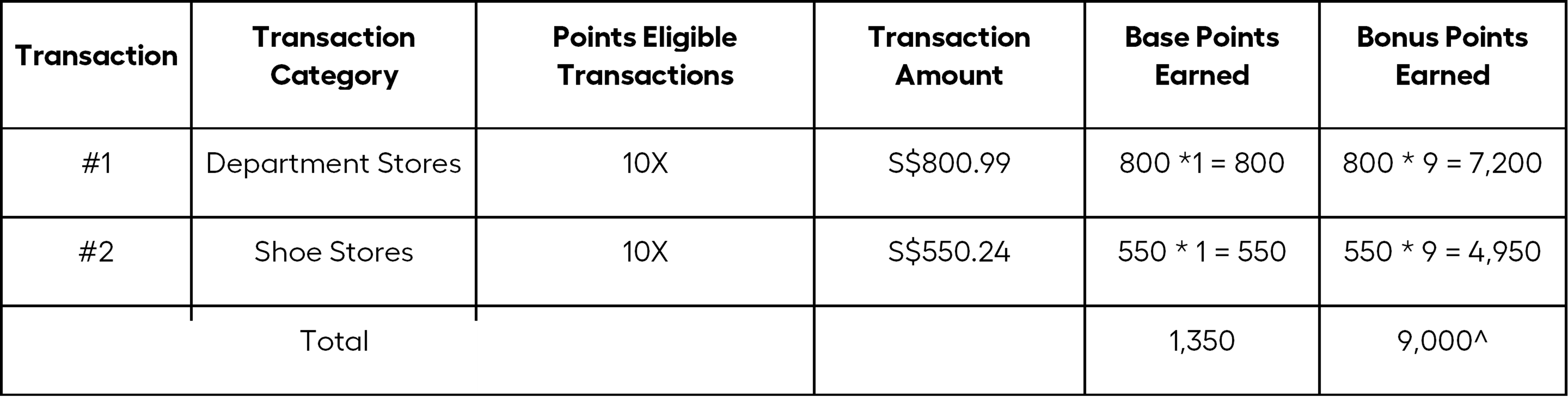 Eligible card holders will be awarded a total of 10,350 Points (1,350 Base Points + 9,000 Bonus Points) for the statement month. For more information, refer to the terms and conditions.