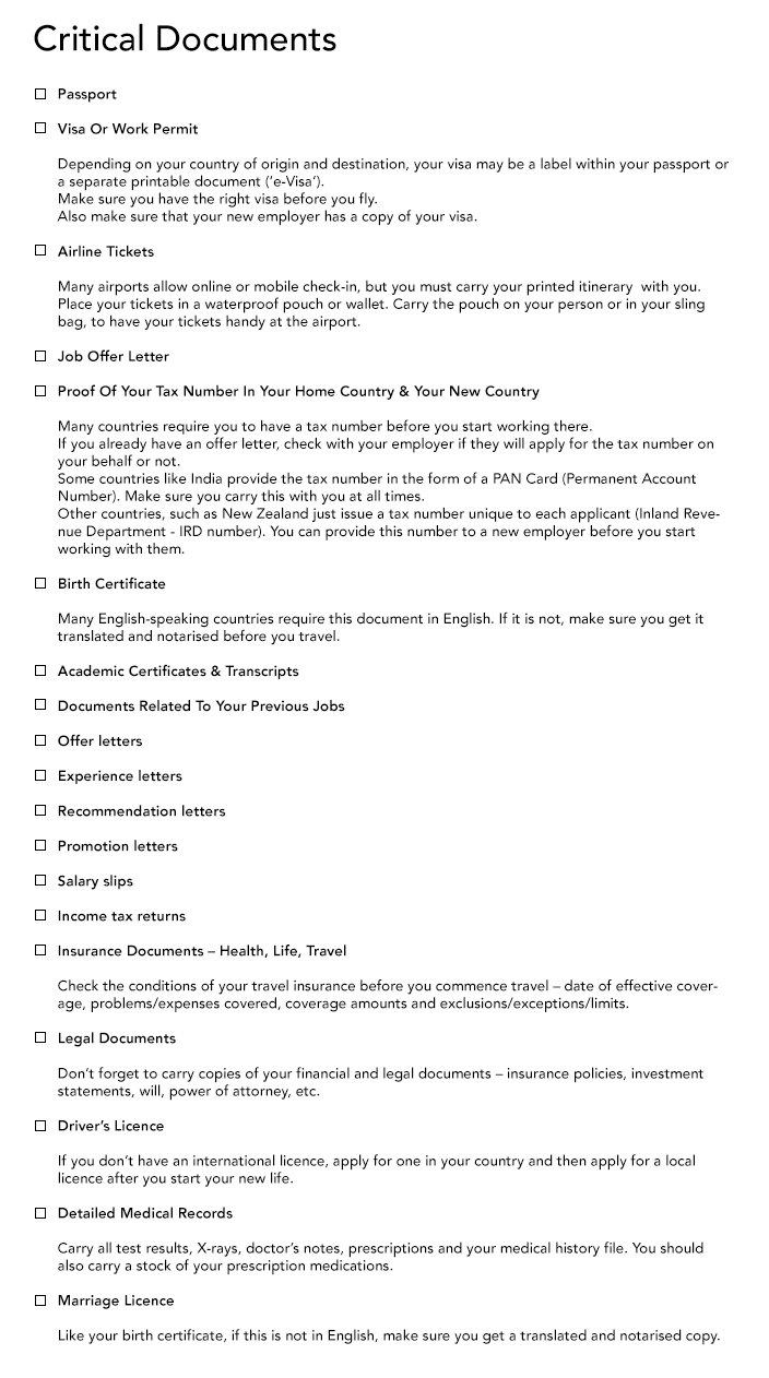 - Check that all your travel paperwork is in order. This will include your passport, visa, work permit, tickets, travel insurance, etc.