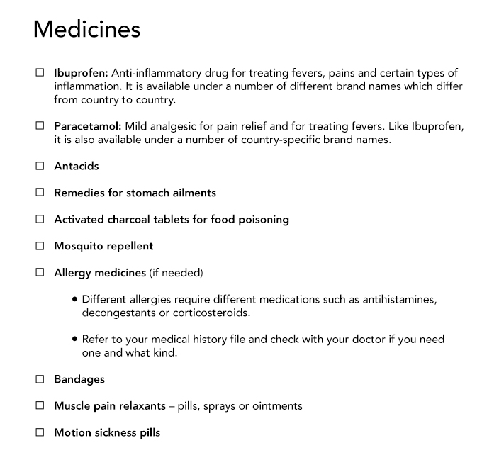 You should also carry some over-the-counter (OTC) medications with you. You will probably find these quite easily in your new country, but it is still prudent to carry your own stock while you take time to understand the medical system there. These include: