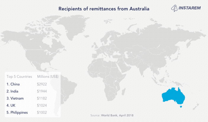 Australia – According to the World Bank estimates, remittances from Australia could be worth US$ 16 bn – including US$2,922 mn to China, US$ 1,944 mn to India, US$ 1,182 mn to Vietnam, US$ 1,084 mn to the UK and US$ 1,002 mn to the Philippines.
