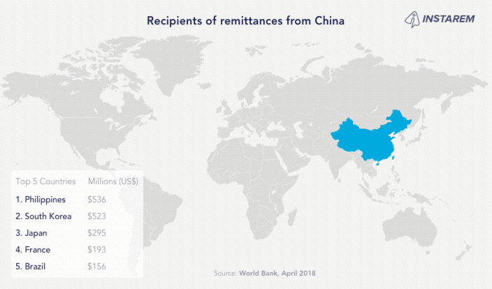 China – According to the WB estimates, in 2017, China sent high remittances to Philippines (US$ 536 mn), South Korea (US$ 523 mn), Japan (US$ 295 mn), France (US$ 193 mn) and Brazil (US$ 156 mn).