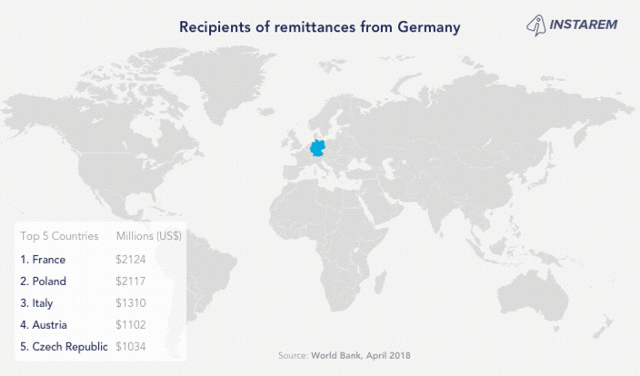 The biggest recipients of Germany remittances in 2017 are France (US$ 2,124 mn), Poland (US$ 2,117 mn), Italy (US$ 1,310 mn), Austria (US$ 1,102 mn) and Czech Republic (US$ 1,034 mn).