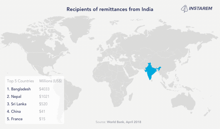 India – In 2017, the remittances from India totalled US$ 5,710 million. The bulk of this went to Bangladesh (US$ 4,033 mn), followed by Nepal (US$ 1,021 mn), Sri Lanka (US$ 520 mn), China (US$ 41 mn) and France (US$ 15 mn).