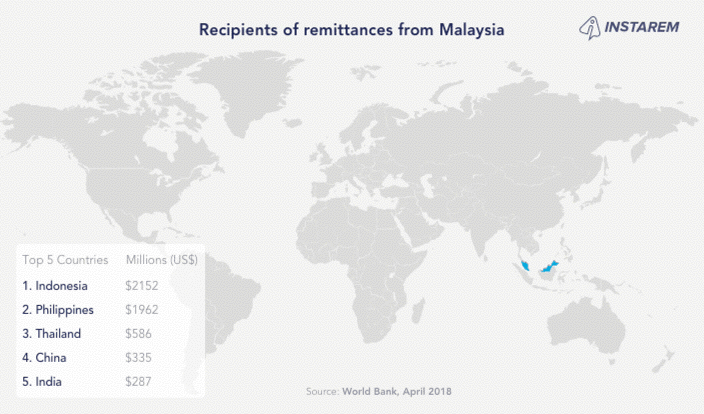 Malaysia – In 2017, Indonesia (US$ 2,152 mn), Philippines (US$ 1,962 mn), Thailand (US$ 586 mn), China (US$ 335 mn) and India (US$ 287 mn) were the biggest recipients of remittances from Malaysia.