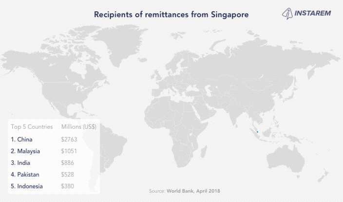 In 2017, Singapore sent remittances to China (US$ 2,763 mn), Malaysia (US$ 1,051 mn), India (US$ 886 mn), Pakistan (US$ 528 mn) and Indonesia (US$ 380 mn).