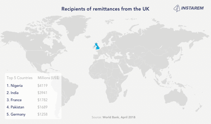 The bank estimates, in 2017, the UK sent US$ 4,119 million in remittances to Nigeria, US$ 3,941 million to India, US$ 1,782 million to France, US$ 1,689 million to Pakistan and US$ 1,258 to Germany.