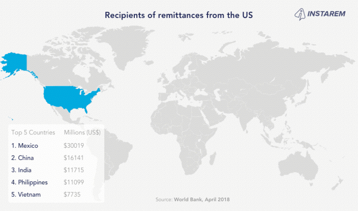 The biggest recipients of US remittances in 2017 are Mexico (US$ 30,019 mn), China (US$ 16,141 mn), India (US$ 11,715 mn), Philippines (US$ 11,099 mn) and Vietnam (US$ 7,735 mn).