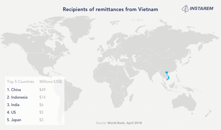 Vietnam – In 2017, the biggest recipients of remittances from Vietnam were China (US$ 49 mn), Indonesia (US$ 14 mn), India (US$ 6 mn), Japan (US$ 3 mn) and Belgium (US$ 3 mn).