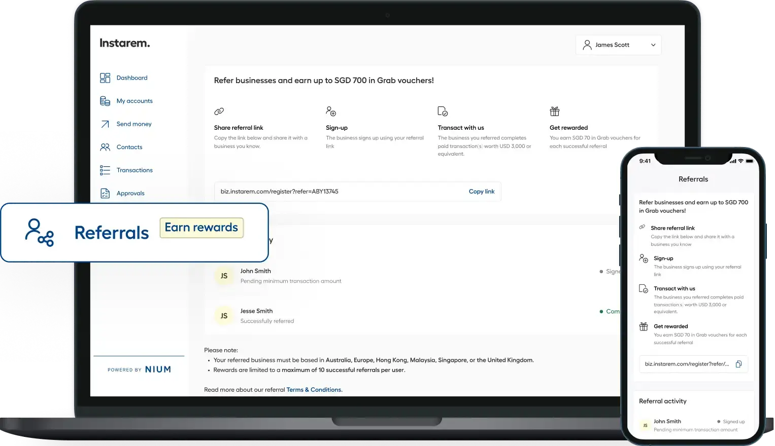 Head to the ‘Referrals’ section in your Instarem business account, copy your unique referral link, and share it with businesses you know.